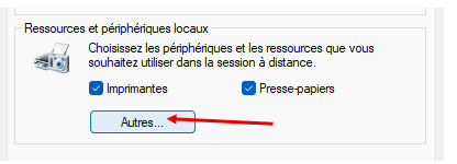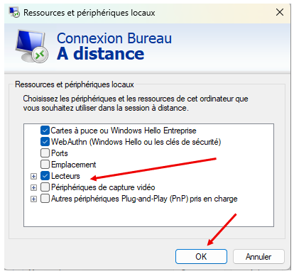 Dans l'outil de Connexion Bureau à distance sélectionner l'onglet Ressources locales, puis Autres... et dans la fenêtre qui s'ouvre cocher Lecteurs et enfin OK.