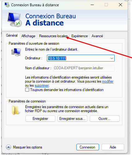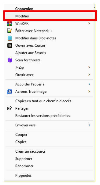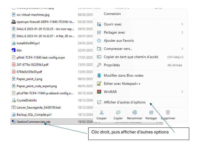 Il faut pour cela créer un fichier .rdp pour la connexion au bureau à distance vers le RDPCODA. S'il existe déjà, fait un clic droit dessus, puis Afficher d'autres options et Modifier