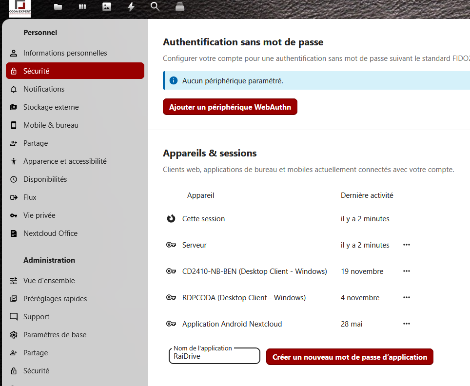 Afin de pouvoir installer RaiDrive sur un poste, il convient d'avoir au préalable créé une clé d'accès (compte d'application) depuis l'interface Nextcloud